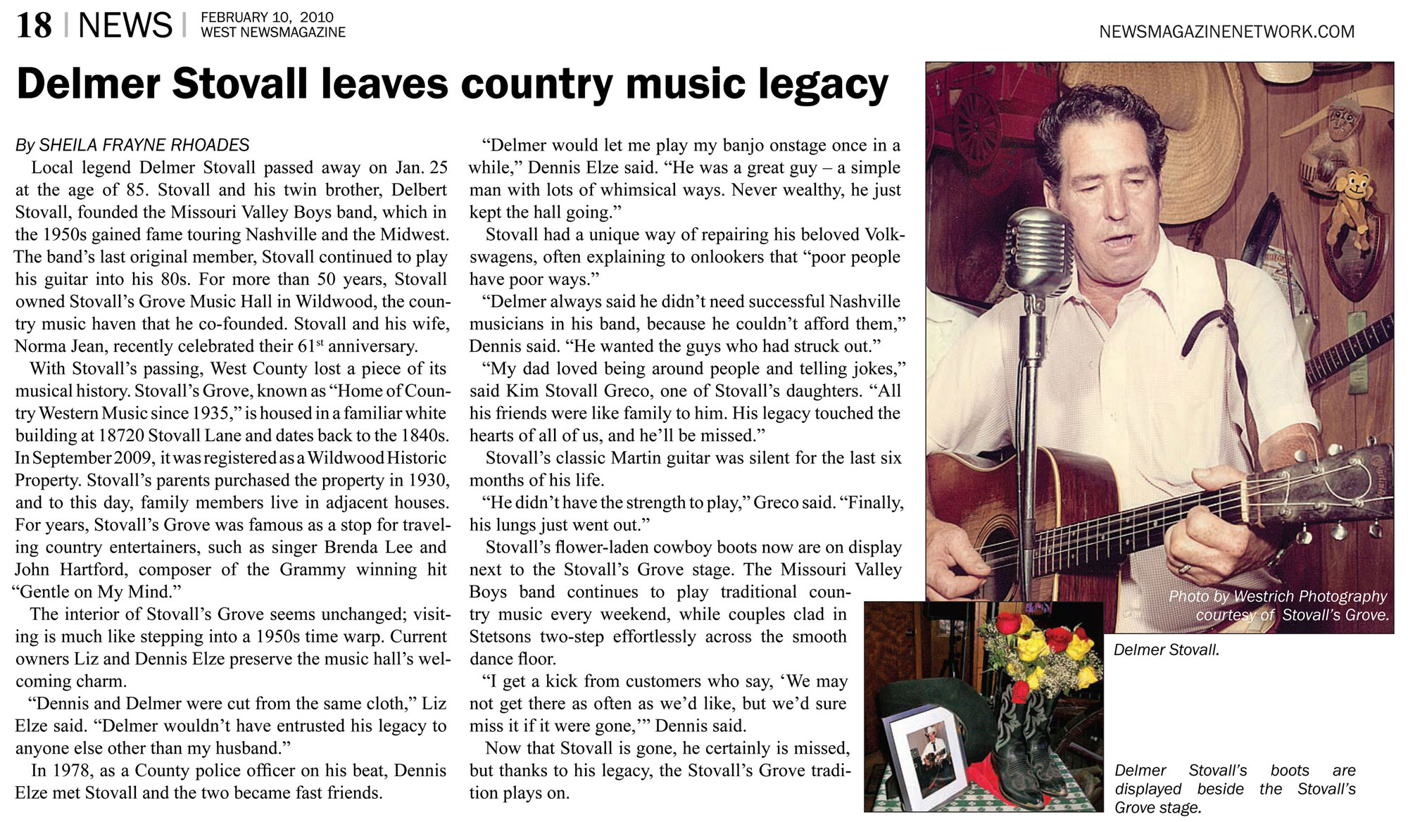 Local legend Delmer Stovall passed away on Jan.25 at the age of 85. Stovall and his twin brother, Delbert Stovall, founded the Missouri Valley Boys band, which in the 1950’s gained fame touring Nashville and the Midwest. The band’s last original member, Stovall continued to play his guitar into his 80’s. For more than 50 years, Stovall owned Stovall’s Grove Music Hall in Wildwood, the country music haven that he co-founded, Stovall and his wife, Norma Jean, recently celebrated their 61st anniversary.