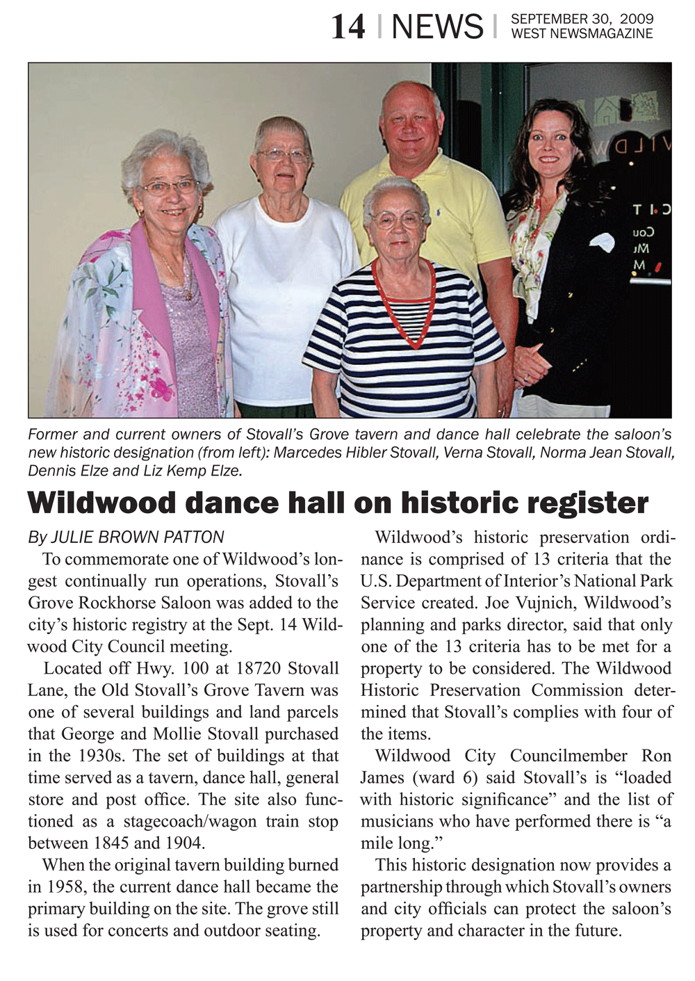 With Stovall’s passing, West County lost a piece of it’s musical history. Stovall’s Grove, known as “Home of Country Western Music since 1935, “is housed in a familiar white building at 18720 Stovall Lane and dates back to the 1840’s. In September 2009, it was registered as a Wildwood Historic Property. Stovall’s parents purchased the property in 1930, and to this day, family members live in the adjacent houses. For years Stovall’s Grove was famous as a stop for traveling country entertainers, such as singer Brenda Lee and John Hartford, composer of the Grammy winning hit “Gentle on my Mind”.