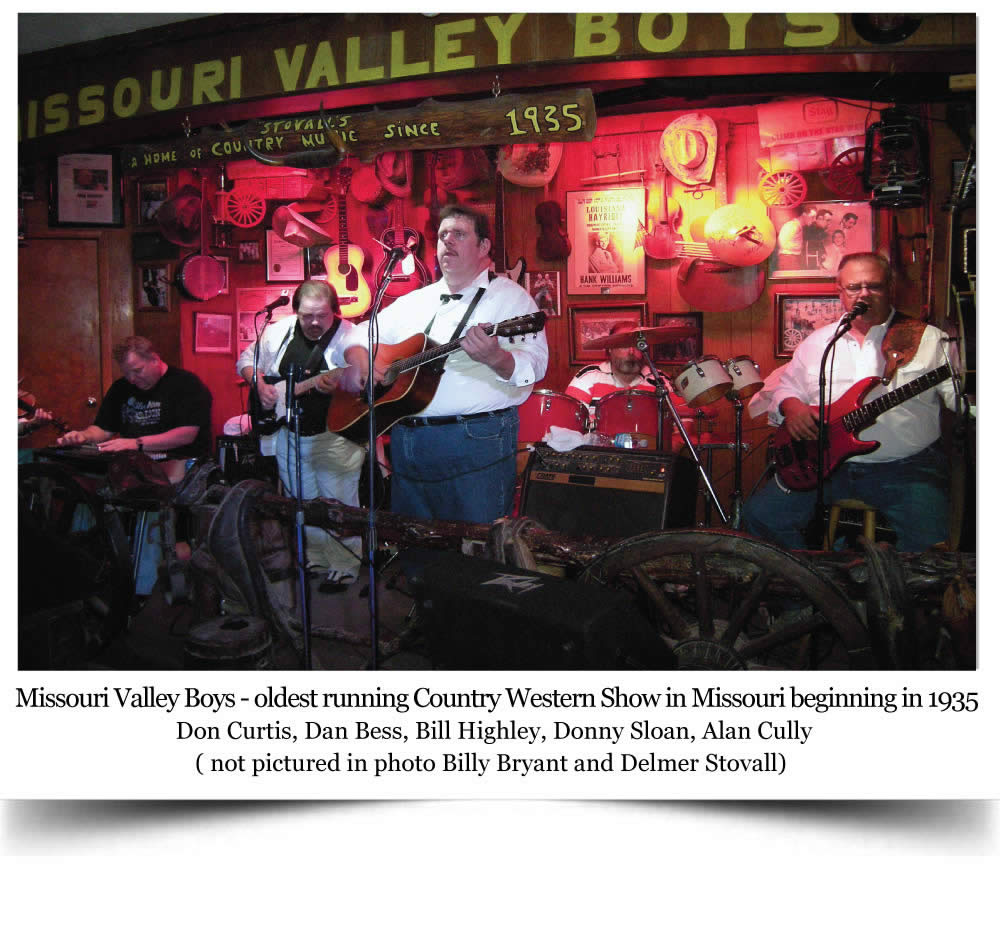 - Missouri Valley Boys have made Stovall’s Grove the “Home of country music since 1935” featuring Traditional Country Western and Hillbilly music. Musical talents of the Missouri Valley Boys showcase Allen Cully, on vocals and bass, Terry Miller on vocals and guitar, Donny Sloan on drums, Fred Williams, lead guitar and vocals, Mark Vaccaro on fiddle and Pat Heller on pedal steel guitar . Step back into genuine country music history with classic songs made famous by Ray Price, George Jones, Ernest Tubbs, Lefty Frizell, Merle Haggard, and Hank Williams. Ain’t country music without the pedal steel guitar and fiddle player. Occasional yodeling. Two step, country western line dancing, cloggin’, and good old fashion slow dancing. Ya’ll come!