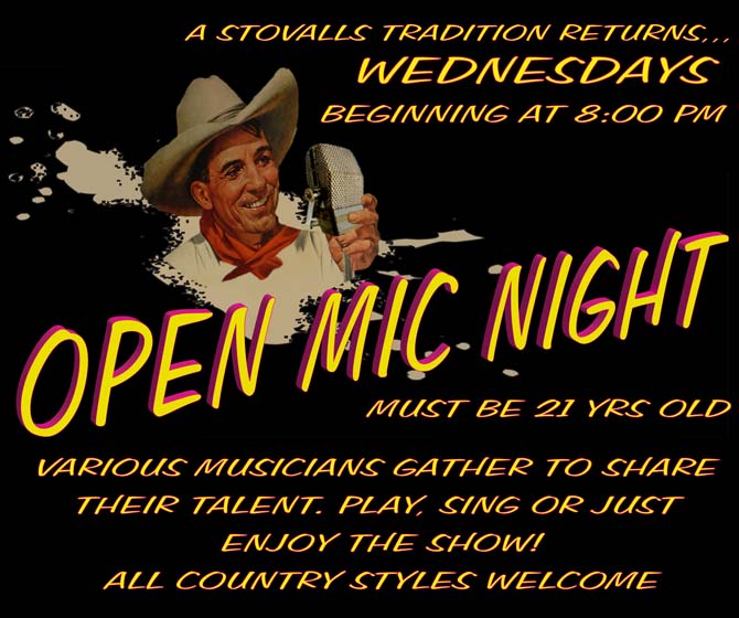 - Razzle Dazzle with your talent at the time honored tradition of open mike at Stovalls,Open Mic Wednesdays. Various musicians gather to share their musical guitar, bass, fiddle, accordion and vocals with much impromptu harmonies, voicings, and great fun. Play, sing, or just enjoy watching the shows. All welcome. Any style related to country.